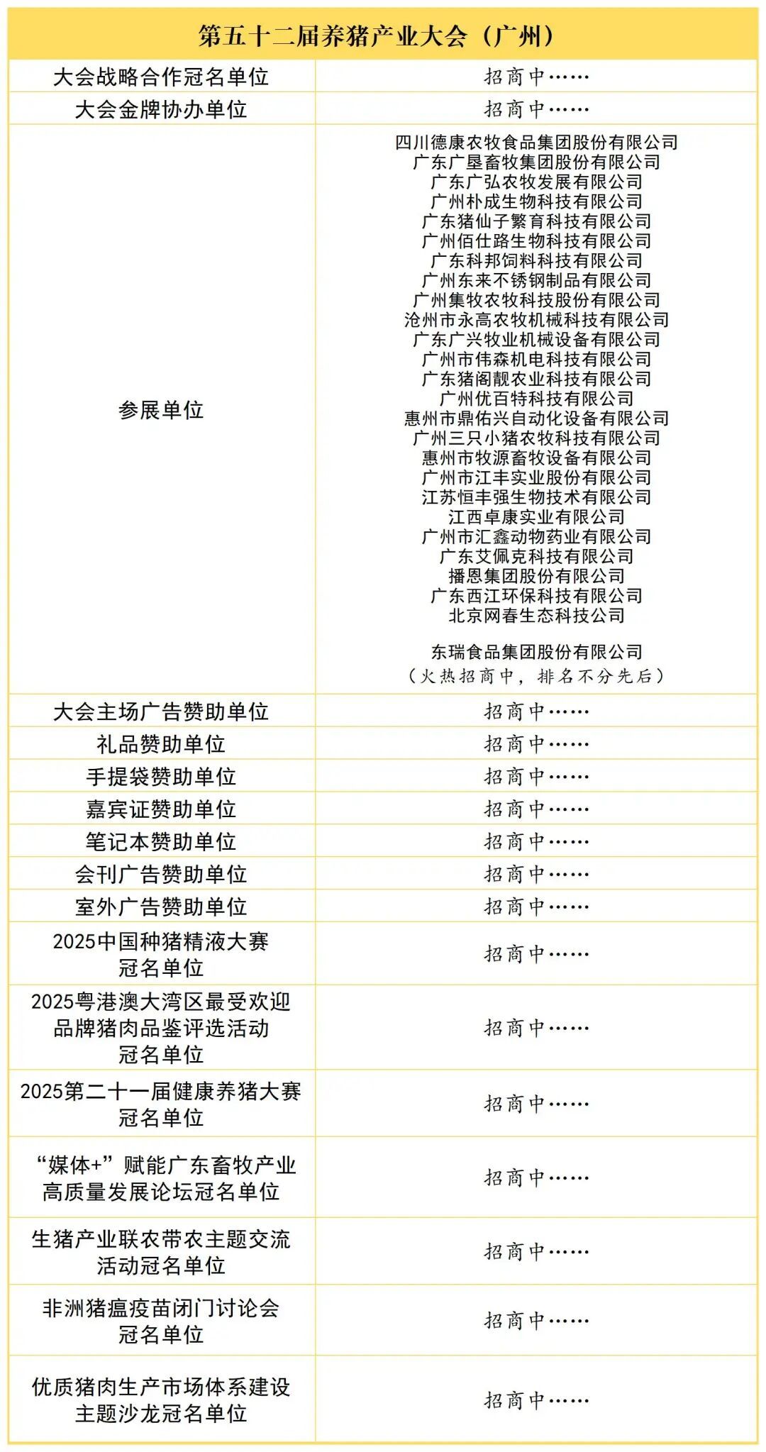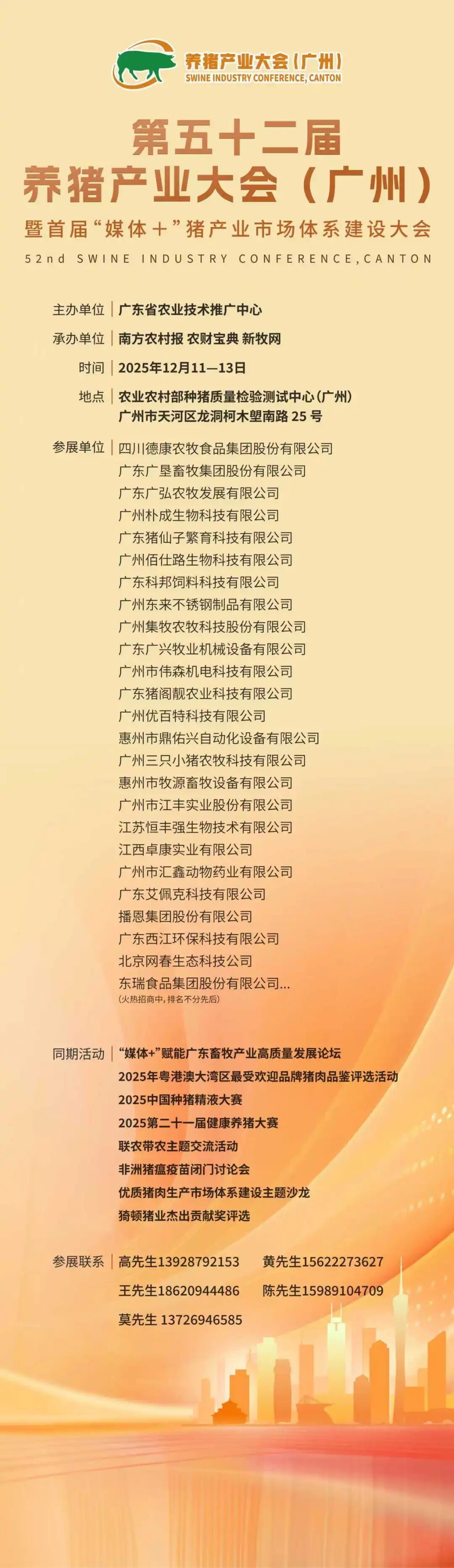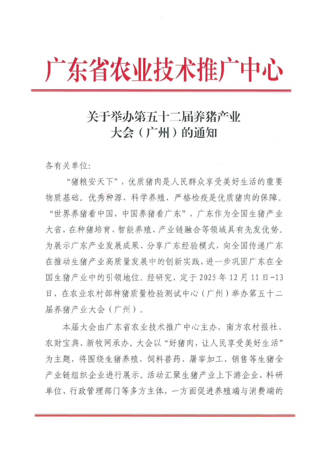2025年12月11-13日,第五十二届养猪产业大会(广州)将于广州柯木塱农业农村部种猪质量检验测试中心隆重召开。